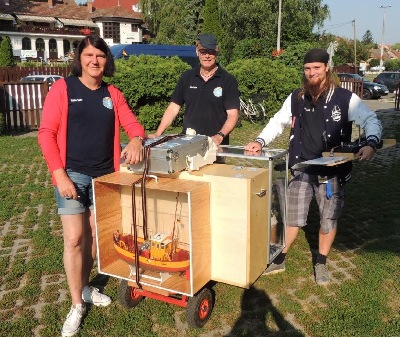 Und nun sind wir dran! Die Schiffe ins Wasser, und los geht’s. Beim Retten des Fischers aus dem To Bánk (Bánker See) senkt sich das Bergenetz aber nicht tief genug ab und greift nicht unter den Fischer, sondern schiebt ihn immer weg. Diese für unser Programm sehr wichtige Funktion müssen wir aufgeben. Das Löschen der brennenden „Hildesia“ funktioniert, aber beim Überschießen der Schleppleine trifft auch diese nicht und die zweite wichtige Funktion des Programms geht in die Hose. Entsprechend frustriert sind wir beim Rausholen unserer Boote, und es hilft nur noch Daumen drücken, dass der erste Lauf gut genug war. Am Abend dann die erlösende inoffizielle Mitteilung: ja, es hat gereicht, wir sind Weltmeister. Aber wir müssen bis Morgen warten, dann wird das Ergebnis offiziell veröffentlicht, und wird gültig. Trotzdem gehen wir erleichtert zum gemeinsamen Abendessen zu unserer erklärten Lieblings-Pizzeria in Bánk (na gut, es gibt nichts wirklich anderes außer dem großen Wellness-Hotel und dem Imbiss bei unserem Hotel).